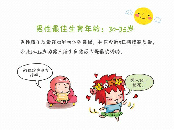 如果超过了35岁的话,男性精子质量就会骤然下降,精子染色体疾病增加,对于孩子有着很大的影响,考虑优生优育的家庭就要抓紧最佳的时机了。