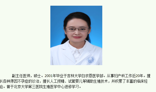 朱越英,吉林大学第一医院生殖医学中心副主任医师,硕士。2001年毕业于吉林大学白求恩医学部。从事妇产科工作10余年。